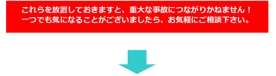 もし事故が発生し、たくさんの方々にご迷惑をおかけしてしまってからでは手遅れです。早めのご対応・ご相談をお願い致します。
