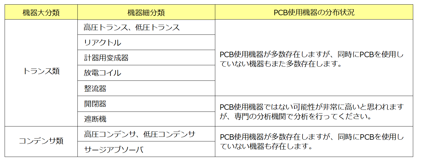 PCB使用機器の判別方法のうち、主要なものとしては以下の方法がありますが、製造年だけではPCB判定が確定できない場合がありますので、必ず、型式や銘板記載事項により、確認していただくようご注意ください。